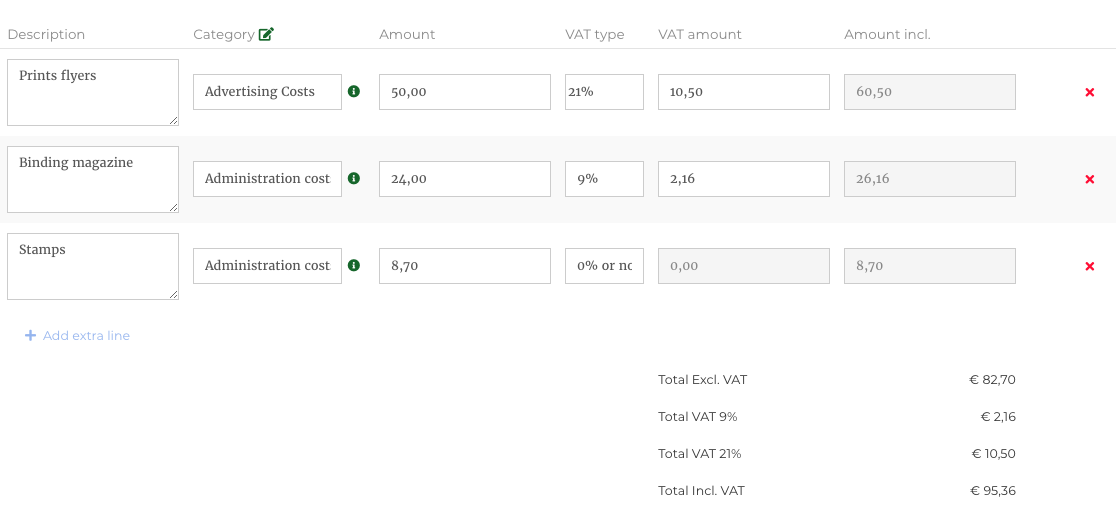 Is it possible to add various types of expenses or vat percentages to one expense?