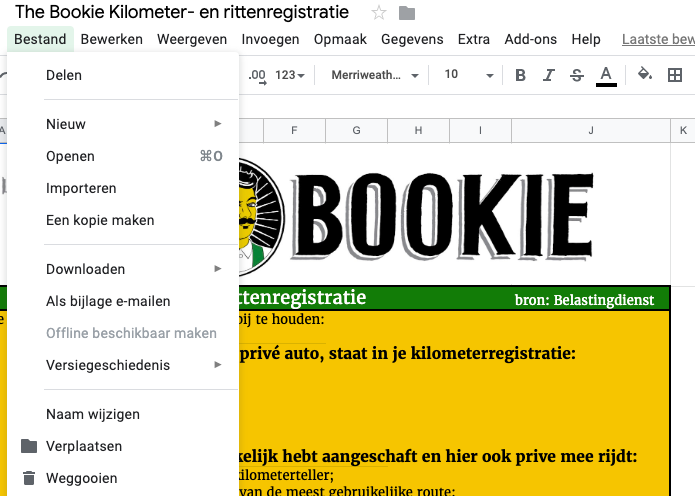 In order to be able to register your mileage easily, we have drafted a document. Follow the link and make a copy (click on File -> Make Copy) and place it in your own Google Drive or download the file.